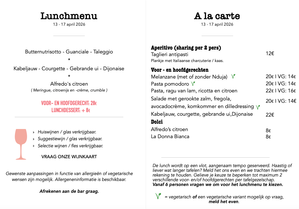 - MA – DI – DO – VR: lunch: 12u – 14u.